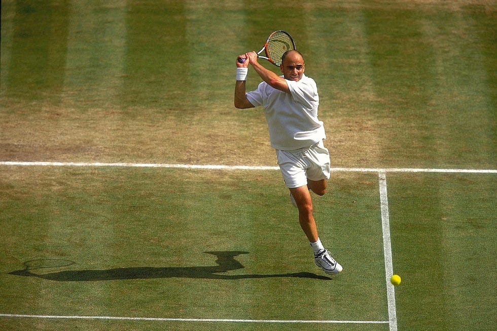 E poi c’è il caso più letterario di tutti: Andre Agassi. Talento prodigioso, ribellione, caduta, rock, redenzione. Esplode insieme a Pete Sampras, raggiungendo subito risultati pazzeschi; ma arriva la caduta. Per anni sembra perdersi, smarrendo non solo il tennis ma il senso stesso di ciò che fa. Poi cambia tutto. Cambia il contesto, cambiano le relazioni, cambia il modo di allenarsi. Si libera da suo padre, si allontana da Nick Bollettieri, incontra Steffi Graf, costruisce un nuovo equilibrio. E lì, tra i trenta e i trentacinque anni, diventa il giocatore più completo della sua carriera. Non il più spettacolare, ma il più vero, un vero numero uno, dall’empatia totale con il pubblico. Chi ama il tennis ama Agassi, anche se non lo ha mai visto giocare una sola volta.